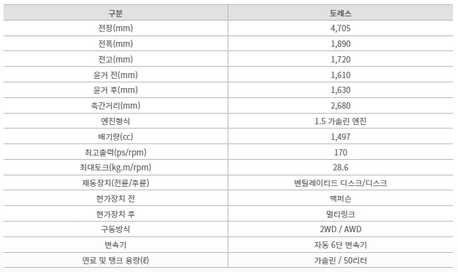 사이즈는 상당한 크기로 타 준중형모델에 비해서는 확실히 큰 모습이고, 특히나 실내공간은 상당한 수준입니다. 같은 브랜드의 티볼리도 거의 중형급의 실내공간감을 보여주는데요. 토레스는 한층더 커다란 공간을 자랑합니다. 변속기는 6단변속기로 타브랜드의 7~9단변속기에 비해 조금은 오래된 시스템을 가지고있지만 그만큼 오래된 내구성좋은 구성이기때문에 나쁘다고는 볼수가 없습니다.