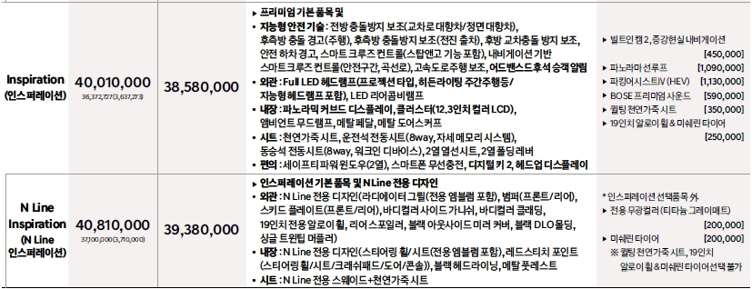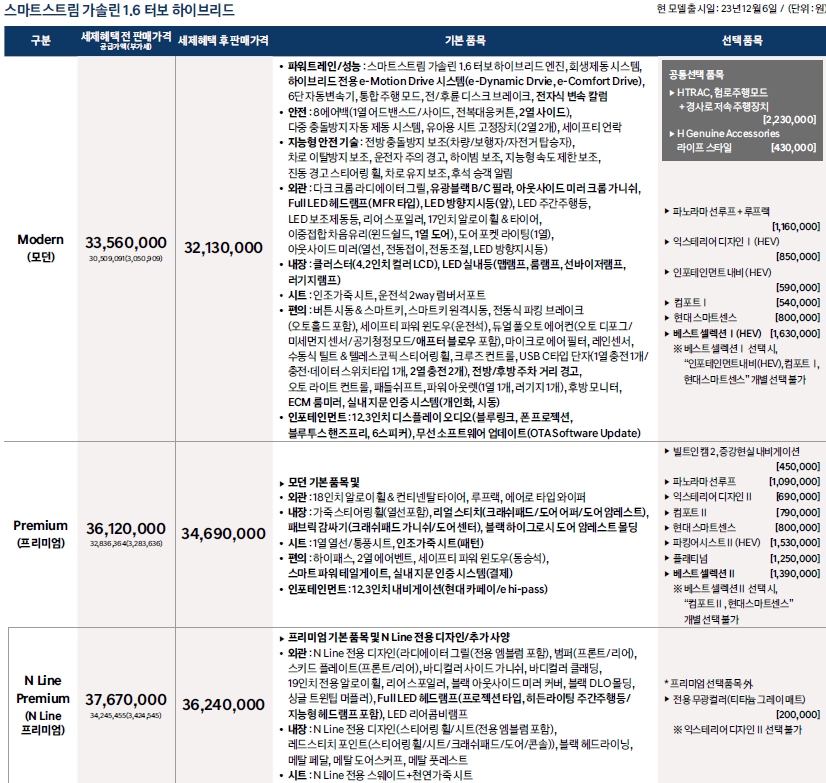 1.6터보하이브리드 입니다. 마찬가지로 150~200정도 상승했습니다. 마찬가지로 프리미엄으로 추천드리며, 스마트센스 파킹어시스트추천드립니다. 개인적으로는 4000이상은 비싼감이 있습니다. 옵션을 더하면 프리미엄도 거의 4000에 육박합니다.