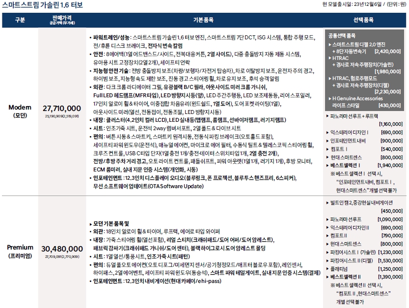 1.6 터보가솔린입니다. 전체적으로 150~200정도 상승했습니다. 실내가 풀체인지급으로 바뀌면서 상승한 부분도 분명 있을것으로 보입니다. 빌트인캠이 2.0으로 바뀌면서 넣을만한 옵션이 되었네요. 사제로 장착이 불안하다면 빌트인캠이 포함된 옵션도 좋아보입니다.  단, 프리미엄등급부터 적용가능하네요. 기본적으로 파킹어시스트와 스마트센스는 기본으로 추가하는걸 추천드립니다. 프리미엄 + 파킹어시스트,스마트센스