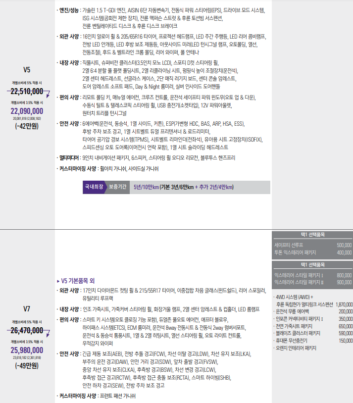 1.5가솔린터보모델의 가격표입니다. 2290만원부터 시작하고, 상위트림인 V7모델은 2598만원입니다. 선택품목을 더하면 기존의 소형SUV와 비슷해질것으로 보입니다.
