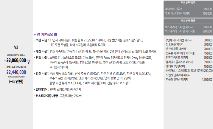 1.6 가솔린자연흡기 모델가격표입니다. 첫출시때 나왔다가 사라진 엔진을 다시 올린 모델입니다. 가성비측면에서 선택을 한것으로 보입니다. 가격은 1883만원부터 시작을 하고, 선택품목은 몇개 없어서 옵션을 다 선택을 한다고 해도 2000만원수준입니다. V3모델은 2244만원이고 옵션을 넣는다면 최대 2700만원 수준까지 올라가게 됩니다. 내비게이션패키지는 필수항목이라고 할수 있겠습니다.