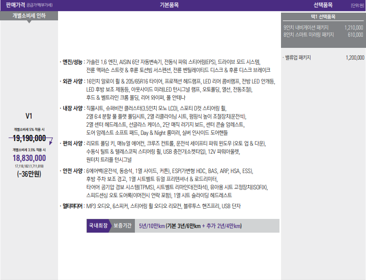 1.6 가솔린자연흡기 모델가격표입니다. 첫출시때 나왔다가 사라진 엔진을 다시 올린 모델입니다. 가성비측면에서 선택을 한것으로 보입니다. 가격은 1883만원부터 시작을 하고, 선택품목은 몇개 없어서 옵션을 다 선택을 한다고 해도 2000만원수준입니다. V3모델은 2244만원이고 옵션을 넣는다면 최대 2700만원 수준까지 올라가게 됩니다. 내비게이션패키지는 필수항목이라고 할수 있겠습니다.