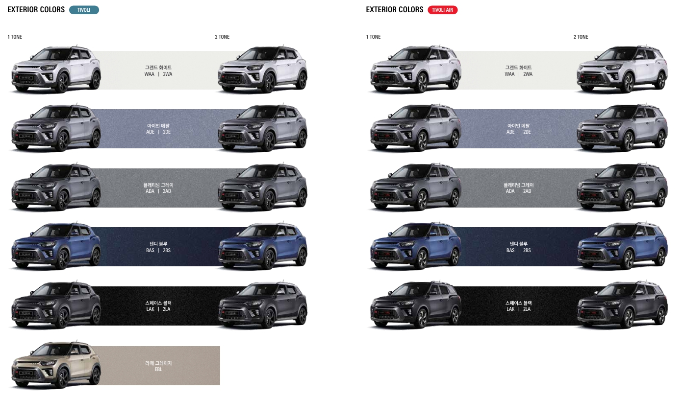 티볼리는 상당히 다양한 색상을 선택할수 있습니다. 거기에 투톤까지 선택할수 있어서 더욱 선택의 폭이 넓습니다.