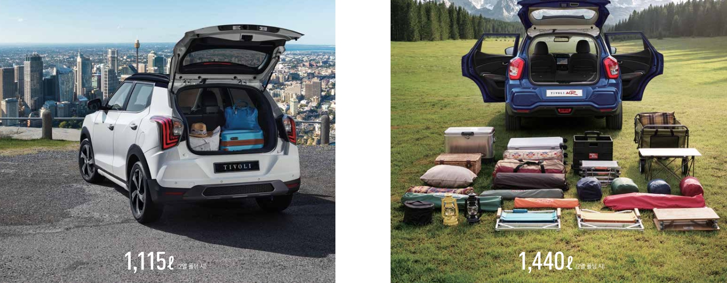 티볼리의 전장은 4255미리이고, 에어모델은 그보다 250미리긴 4495미리입니다. 일반적인 소형SUV모델인 티볼리와 화물칸을 늘린 티볼리 에어가 있는데요. 실용성은 아무래도 에어가 낫다고 할수 있겠습니다. 엔진은 1.6가솔린과 1.5가솔린터보 두가지이고, 미션은 6단 자동변속기입니다. 출시시기에는 6단변속기가 일반적이었지만 지금은 7~8단이 일반적이라 이부분은 조금 아쉽네요. 1.6가솔린모델은 126마력에 15.8토크인데요. 경쟁차량들보다 조금 부족한 힘입니다. 1.5가솔린터보는 163마력에 26.5토크로서 충분한 힘을 발휘합니다.