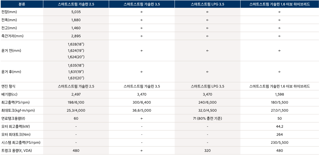 하이브리드는 스마트스트림 가솔린 1.6 터보엔진에 전기모터를 결합한 형태입니다. 합산 출력은 230마력으로 가솔린 3.5정도의 힘을 발휘합니다. 연비가 좋고 특히 발진가속시의 부드러움은 큰 장점이라고 하겠습니다. 또한 배기량이 1.6이기때문에 세금에 있어서도 큰 이득이 있습니다.