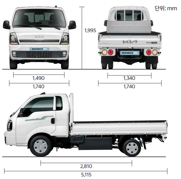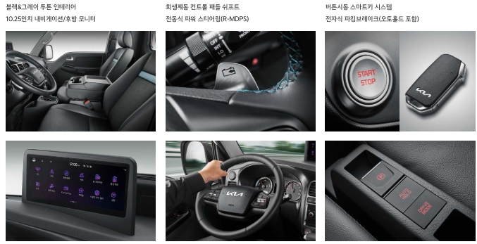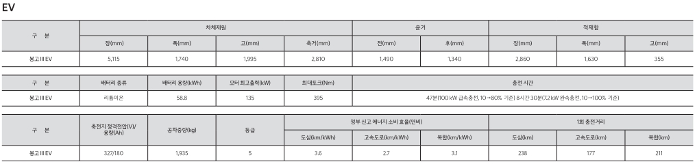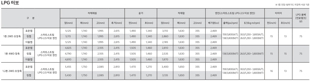 사이즈는 기본적으로 23년식과 동일합니다. 각 1톤과 1.2톤이 존재하며, 사이즈는 그에 맞게 차이가 있습니다. 엔진은 23년식까지는 디젤엔진이 있었지만, 현재는 디젤엔진은 단종이 되고 LPG와 EV모델만 생산을 합니다. 환경규제덕에 디젤엔진은 단종되었습니다. LPG엔진과 디젤엔진의 힘은 비슷하게 130마력대인데요. 토크조차도 비슷한 26입니다. 힘은 비슷할것으로 보여집니다. EV모델은 복합주행거리가 211킬로미터로 시내주행이 적합해보이나 조금만 시내를 벗어나면 추가 충전은 필수로 보여지네요.