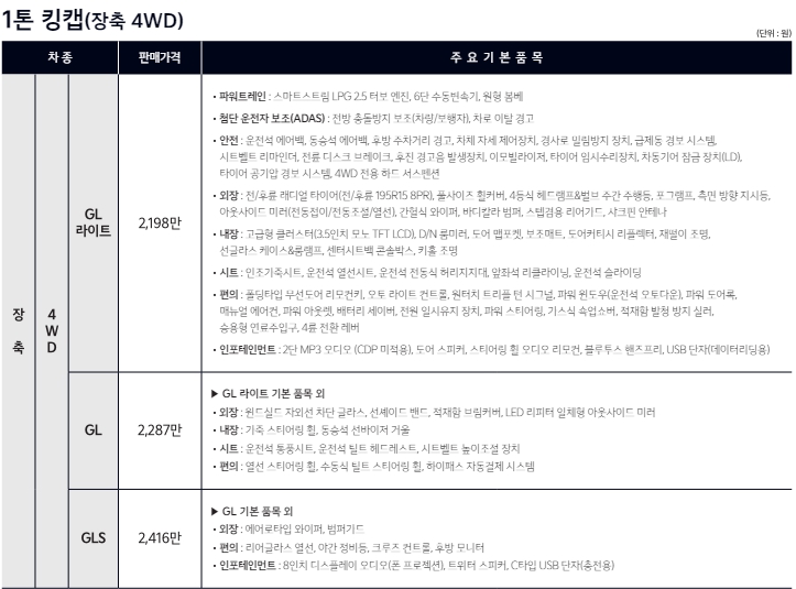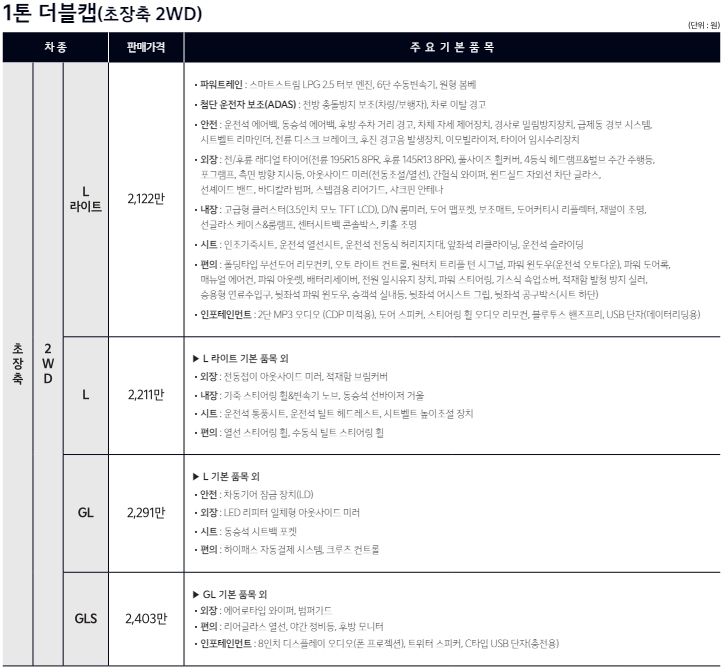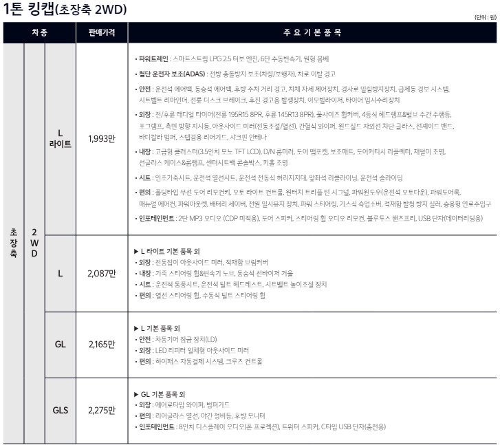 LPG모델은 모든 사양과 트림이 나옵니다. 기본적으로 LPG모델이 주력모델로서 나오는데요. 디젤모델보다 170만원정도 상승하였습니다. 보통 LPG모델이 디젤모델보다 저렴하기 마련인데 반대로 봉고3는 LPG모델이 더 비싸네요.