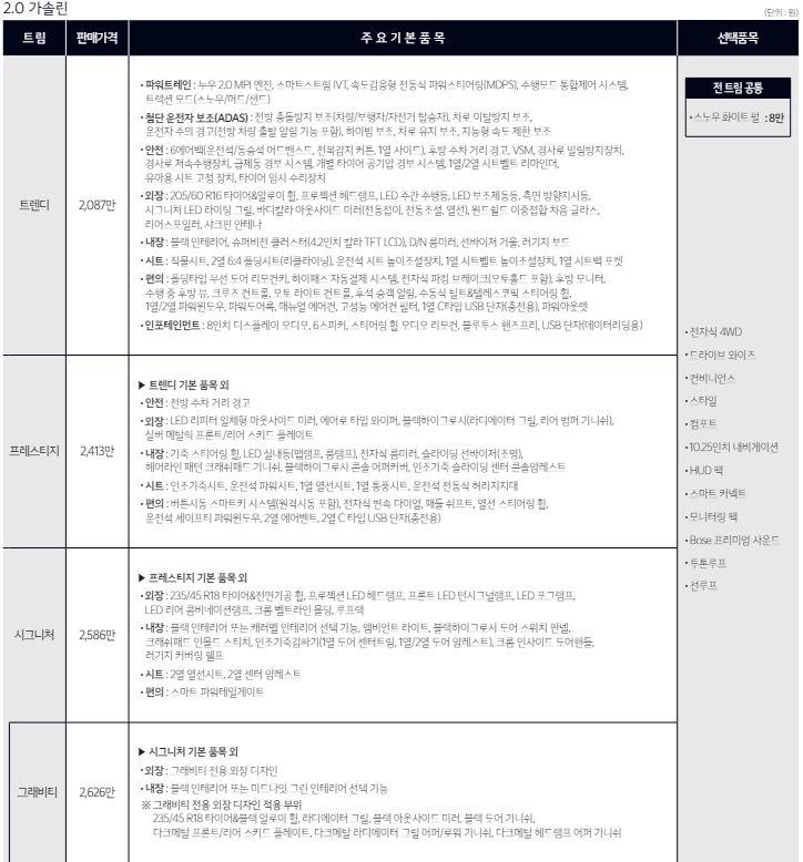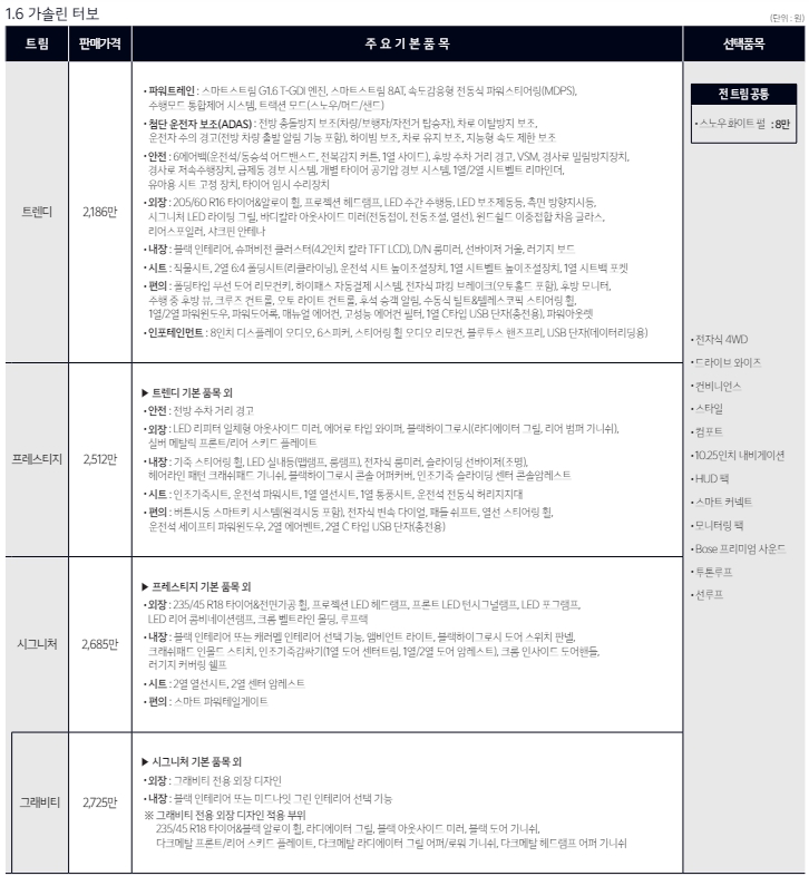 마찬가지로 가솔린모델도 약간의 인하가 이루어 졌습니다. 1.6터보와는 100만원정도의 차이로 개인적으로는 1.6터보를 강력추천드립니다. 세금차이도 적지않게 나기때문에 초기 차량구매차이는 2~3년이면 차이가 매워집니다. 네비게이션, 드라이브와이즈는 필수옵션으로 추가하고, 나머지는 취향에 따라 추가하면 될듯합니다.