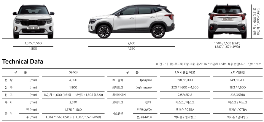 2024 셀토스 최신 가격표 제원 (1.6터보, 2.0가솔린)