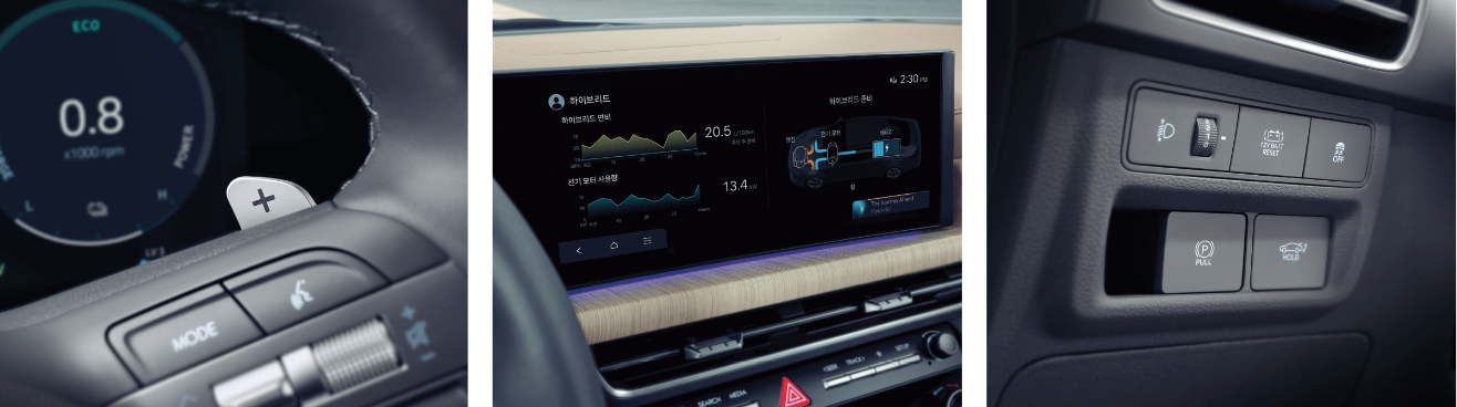 회생제동 컨트롤 패들쉬프트가 있습니다. 하이브리드 차량이라 전용 프로그램이 내장되어있습니다.