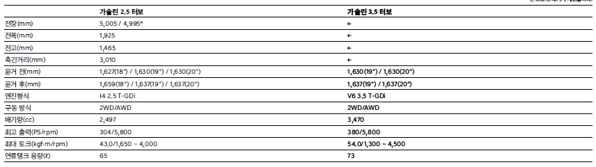 사이즈나 엔진은 동일합니다. 2.5터보가솔린과 3.5터보가솔린으로 일반적으로는 2.5가솔린이 엔트리모델로 인기가 많습니다. 출력은 300마력이 넘기때문에 일상영역에서 부족한 느낌은 받을수 없습니다. 스포츠드라이빙을 원하는 분은 3.5가솔린으로 가면 됩니다만, 세금부분이 부담이네요.