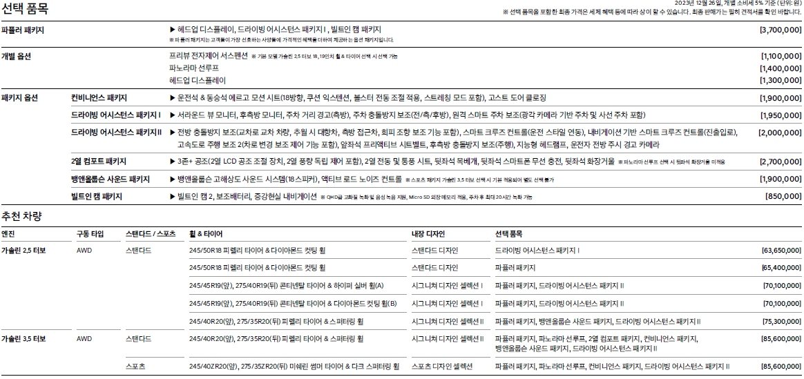 여타 현대기아와는 달리 기본모델에서 추가하는 방식으로 가격을 책정할수 있습니다. 기본은 2.5터보이고, 3.5터보로 업그레이드는 660만원을 추가하면 됩니다. 기존 모델보다 대략 350만원정도 상승하였는데 외부보다는 실내의 변화로인한 차이라고 볼수 있겠네요. 하지만 풀체인지도 아닌데 350상승은 좀 과하다는 생각이 듭니다.