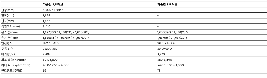 내연기관모델은 가솔린2.5터보와 3.5터보모델이 있습니다. 2.5터보는 304마력이고 3.5터보는 380마력입니다. 월등한 힘을 자랑하는 3.5마력의 모델은 수입차량의 고사양모델과 비슷한 성능을 보여줍니다. 하지만 보통은 2.5터보로도 차고 넘치는 성능이기에 가성비를 고려한다면 2.5터보를 추천드립니다. 나머지 사이즈부분은 큰차이는 없습니다.