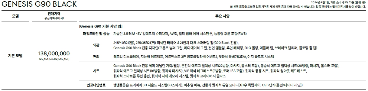 제네시스 G90 의 2024 년형 모델입니다. 한국의 최고 플래그십 세단으로서 가장 비싸고 가장 고급스러운 모델입니다. 그동안 롱휠베이스모델과 숏바디 모델이 있었지만 이번에 블랙모델이 추가 되었습니다. 1억 이하의 최고급모델로서 가격은 얼마인지 확인해보도록 하겠습니다.