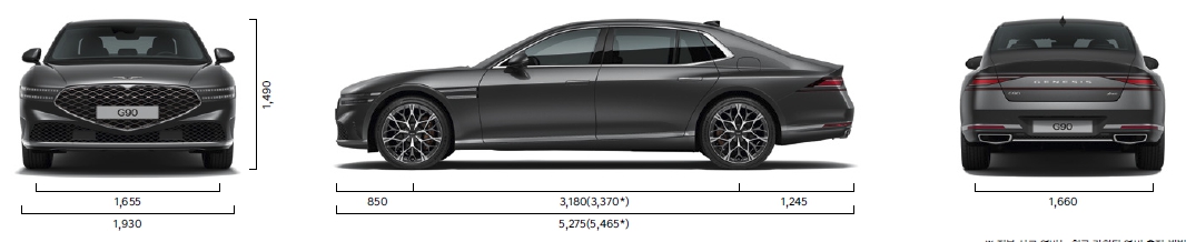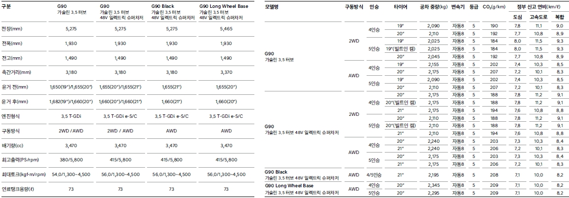G90 모델은 가솔린 3.5터보모델을 베이스로 일렉트릭 슈퍼차저인 하이브리드모델이 있습니다. 길이는 5200미리가 넘어갈정도로 상당히 큰 길이를 자랑하고, 롱휠베이스는 5400미리가 넘는 길이입니다. 각각 이륜모델과 사륜모델이 있고, 연비는 8~9키로 수준으로 크기와 무게를 감안하면 준수한 수준이라고 할수 있습니다.