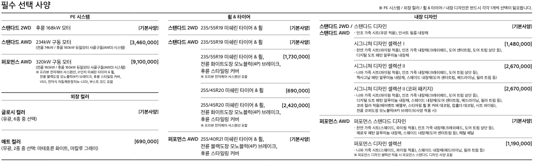 기본가격 6700만원대에서 시작합니다. 하지만 필수선택사양이 있는데요. 바로 이륜과 사륜을 선택해야 하고 휠타이어등을 고른후 선택옵션을 통해서 최종 가격이 도출됩니다. 기본적으로 가격이 저렴하지는 않는데요. 전기차 보조금을 모두 받을경우 5000만원대로 구매가 가능합니다.