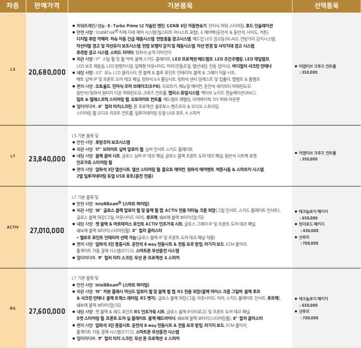 기본적으로 사양은 동일합니다. 각 가격표마다 차이가 있는데 ls 트림의 경우 2090만원에서 2068만원으로 22만원 인하를 하였고, lt의 경우 2410만원에서 2384만원으로 26만원 인하하였습니다. 액티브트림은 2730만원에서 2701만원으로 29만원 인하하였습니다. rs는 2790만원에서 2760으로 30만원 인하하였습니다. 전체적으로 22~30만원 인하하였고, 개소세 인하했을때와 비교시 10~20정도 갭은 있습니다. 하지만 인하효과로 거의 개소세인하혜택과 차이가 없는 가격으로 구입할수 있겠네요.