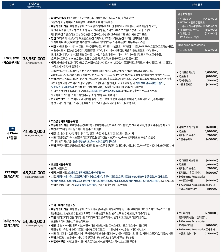 3896만원부터 시작합니다. 디젤로 변경을 원한다면 추가금이 필요한데요. 세금을 제외하고는 모든부분에서 3.8가솔린이 좋습니다. 디젤로 바꿀이유가 있을지 모르겠네요. 작년말에 추가된 르블랑 트림을 추천드립니다. 가장 많은 선호옵션이 포함된 트림으로서 스마트센스나 주차보조시스템같은 옵션만 추가하면 됩니다.