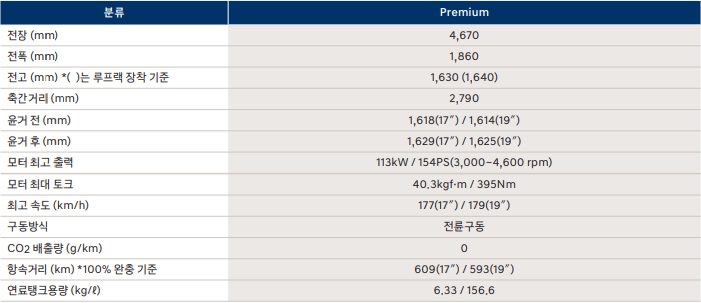 전장은 4670입니다. 원래 중형차급으로 출시를 하였지만 스포티지와 투싼등의 차량이 체급이 커지면서 준중형급으로 하향되었네요. 아무래도 내년에 출시할 2세대 넥쏘는 최소한 100미리 이상 체급을 키울것으로 보입니다. 모터힘은 113kW 급인데요. 지금기준으로는 아무래도 힘이 넉넉하지는 않은 모습입니다. 하지만 실내주행기준으로 본다면 전기차 특성상 답답함은 없을것으로 보이네요.