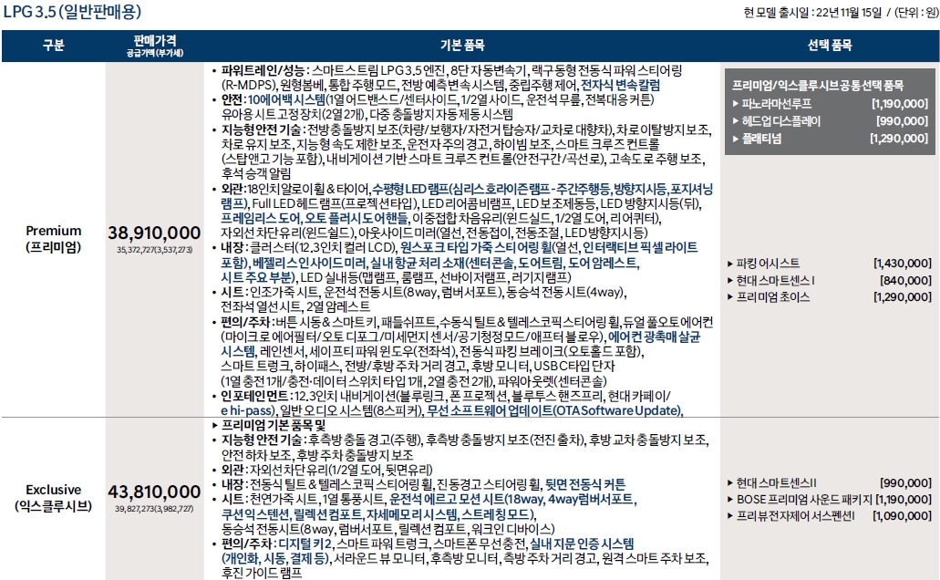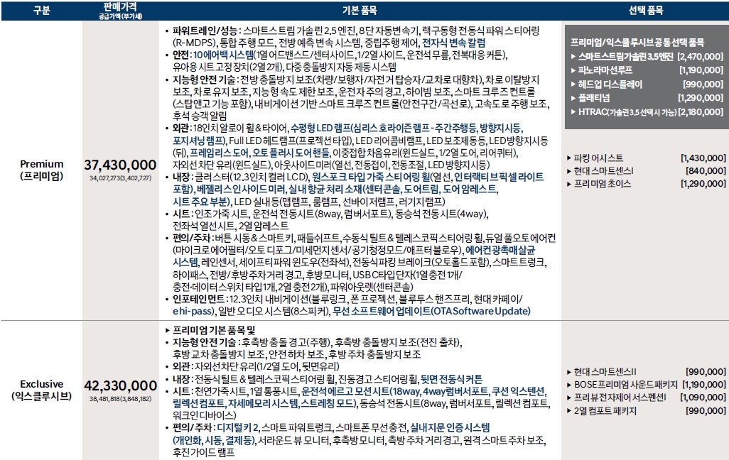 기존2023년대비 가격이 소폭하락하였습니다. 전체적으로 현대차량도 조금은 가격인하가 있어서 좋은 현상이라고 생각이 드네요.