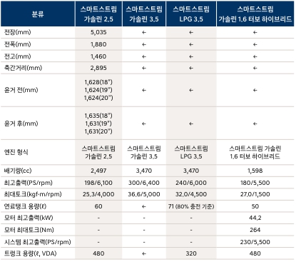 2.5 가솔린엔진 사양입니다. 기존대비 40만원가량 가격인하가 있었습니다.