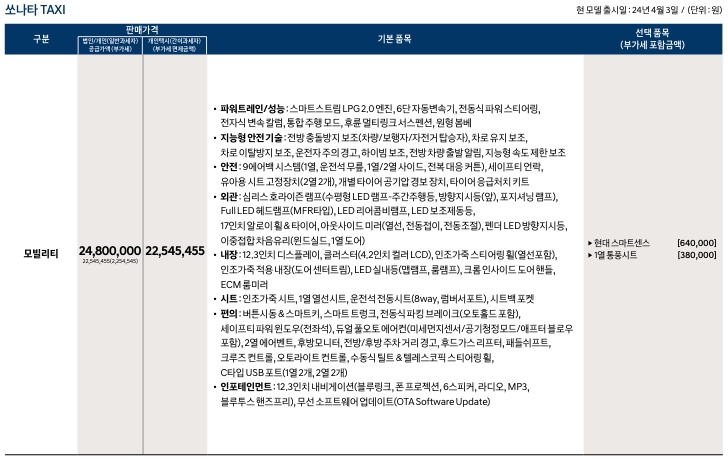 법인택시는 2480만원에, 개인택시는 2254만원에 구매가 가능합니다. 옵션으로는 스마트센스와 통풍시트가 있는데요. 아무래도 오랫동안 머무르는 공간이다보니 두개의 옵션은 넣어주는게 좋겠지요.