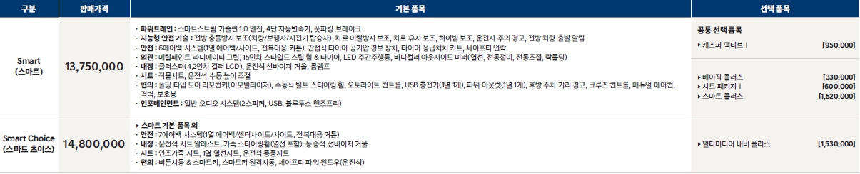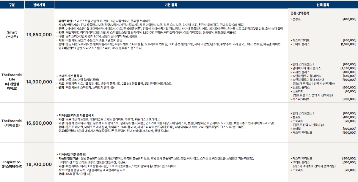 ===2024 캐스퍼 가격표===