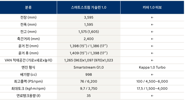당연히 경차기준에 맞는 사이즈로서 최대한 맞춘 사이즈입니다. 사실 타보면 실제로 suv같은 느낌은 크게 나지는 않습니다. 약간 높은 승용차에 앉은 느낌이 납니다. 그래도 경형에서는 확실히 높은 위치에 있지요. 엔진은 1.0 가솔린엔진과 터보엔진이 있습니다. 사실 1.0 기본엔진은 76마력에 9.7토크로 경형치곤 무게가 있는편인데 엔진의 힘은 약합니다. 모닝에 어울리는 엔진이라고 봐야하죠. 그래서 1.0터보엔진을 추천을 드리는데요. 100마력에 17.5토크의 괜찮은 성능을 내어줍니다.