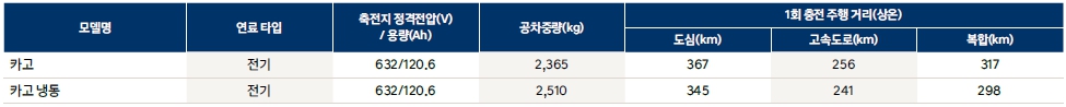 1회 충전주행거리는 복합 300키로 정도가 되고 냉동차량이 무게가 좀더 나가는 관계로 주행거리가 소폭 적습니다.