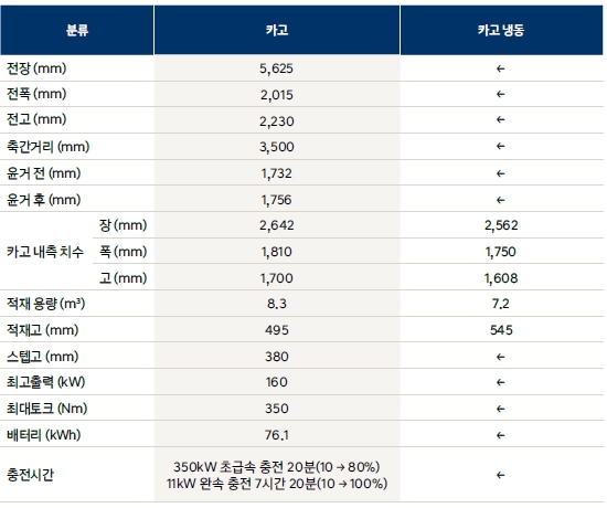 카고 와 카고냉동모두 사이즈는 동일합니다. 내측치수만 두차량이 다른데요. 아마도 냉동시설떄문에 실내측이 조금 작아집니다. 전기차량이기때문에 힘은 의심할 여지는 없는듯하고요. 초급속충전의 경우 20분에 80%까지 충전이 되네요. 초급속 충전기가 많이 보급되면 무척 편리해질것으로 보입니다.