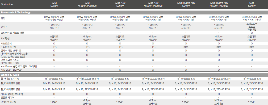 워낙 5시리즈의 종류가 많습니다. 사이즈는 범퍼디자인차이로 조금씩 다르지만 거의 차이는 없습니다. 엔진사양은 2.0리터 가솔린터보모델을 베이스로 530I와 2.0디젤모델이 있습니다. 그외 540I의 고성능모델등 많은 모델이 있고, 들어오는 때에 따라서 같은 모델임에도 옵션차이가 나는경우가 있습니다. 이부분은 꼭 딜러를 통해서 확인해야 합니다.