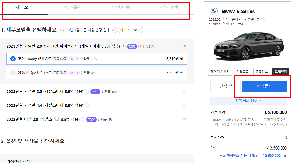 링크 들어가시면 왼쪽부분 탭을 통해서 모델과 옵션 할인이나 혜택등등 선택하시면 셀프로 확인가능합니다.